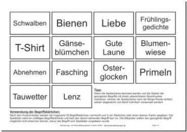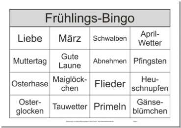 Dieses Bingo-Spiel mit Begriffen zum Thema Frühling ist eine Abwandlung des Spiele-Klassikers Bingo. Anstatt der Bingozahlen und Bingokugeln wurden verschiedene Begriffe, die alle mit der Jahreszeit Frühling assoziiert werden können, verwendet.