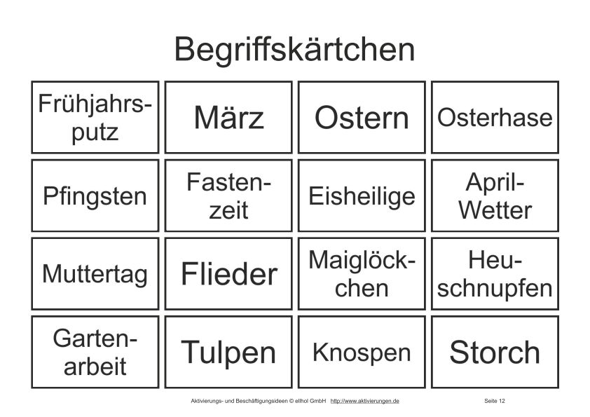 Zwischenzeitlich haben wir unter anderem das Angebot an Themenbingo-Spielen bei aktivierungen.de erweitert. Um auch stärker eingeschränkten Senioren (z.B. bei einer Alzheimer Demenz) das Mitmachen beim Bingo-Nachmittag zu ermöglichen, haben wir mit diesem 16-Felder Themenbingo eine deutlich einfachere und übersichtlichere Themenbingo-Variante entwickelt. Bei diesem einfacheren Themenbingo sind auf jedem Spielschein (auch Bingoschein oder Bingokarte genannt) nur noch 16 Begriffe zum Thema enthalten. Damit umfasst der Bingo-Spielschein 9 Begriffe weniger. Unverändert besteht das Themenbingo-Spiel aber aus insgesamt 10 Spielscheinen in der Größe einer DinA4-Seite.