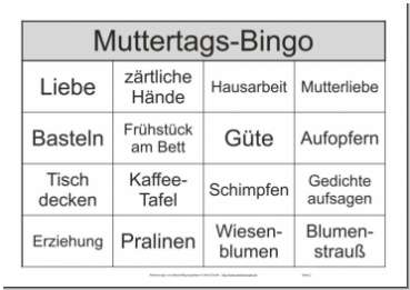 - Weitere Informationen zu den Bingo-Spielen, zum Spielablauf und die Spielregeln zum Themen-Bingo, zur Vorbereitung der Bingo-Runde, zu den Spielscheinen und weitere Hinweise zum Spielablauf sind in der Grundversion des 16-Begriffe-Bingos zum Muttertag enthalten. Es gibt zu jedem Bingospiel immer auch ein Ergänzungsset, um mit noch mehreren Senioren das 16-Begriffe-Bingo und auch das 25-Begriffe-Themenbingo-Spiele für Senioren zu spielen